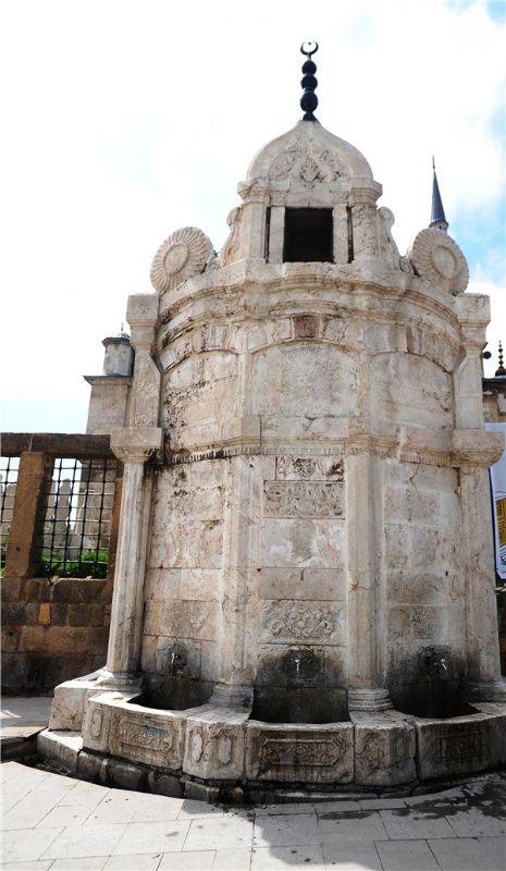 Çeşme, Çapanoğlu Camisi’nin doğu haziresi dış duvarında yer alır. Çeşmenin tarihi kazınmıştır. Buna rağmen orta alınlıkta bir kartuş içinde sene 19 Ağustos 1916 (M. 01 Kasım 1900) yazısı ve tarihi okunmaktadır. Çapanoğlu Camisi’nin doğusunda çarşıya bakan yüzünde hazireye bitişik olarak II. Abdülhamit tarafından 1900 tarihinde tahta çıkışının 25 yıl dönümünde saatli çeşme diye yaptırılmıştır.